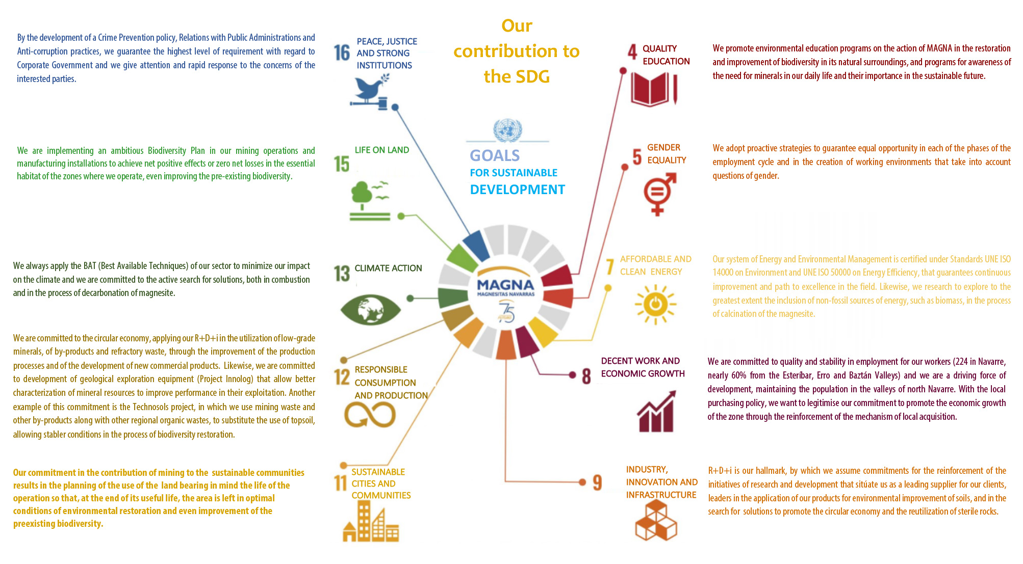With the “Sharing the future” Action Plan, we contribute as a company to achieve the Sustainable Development Goals (SDG) of the United Nations. Although as a leading company in the area, we are a driving force for socioeconomic development and we contribute principally to the territorial balance and to giving life to rural areas, our Sustainability Plan works directly in 10 of the 17 SDGs: