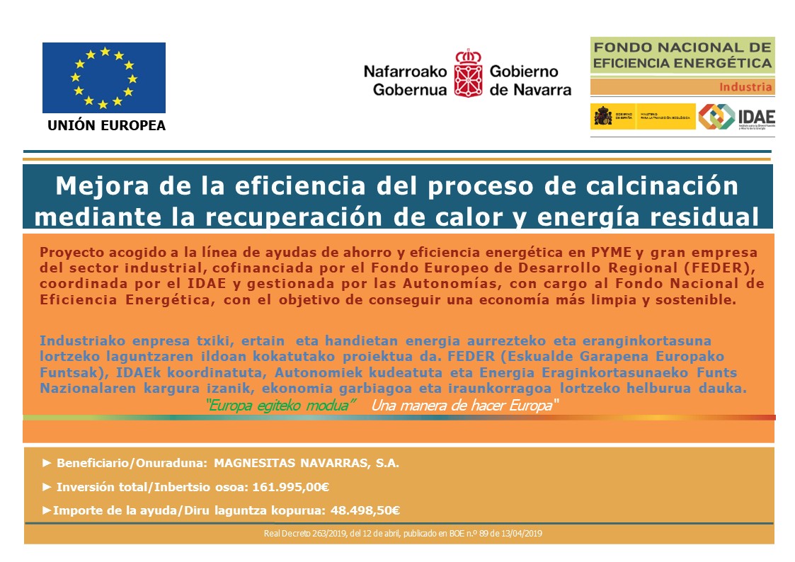 MAGNA ha recibido una ayuda para su proyecto “Mejora de la eficiencia del proceso de calcinación mediante la recuperación de calor y energía residual” dentro de la convocatoria del Programa de Eficiencia Energética en PYME y en Gran Empresa del Sector Industrial concedida por el Gobierno de Navarra y coordinada por el Instituto para la Diversificación y Ahorro de Energía (IDAE), con cargo al Fondo Nacional de Eficiencia Energética y cofinanciada por el Fondo Europeo de Desarrollo Regional (FEDER).